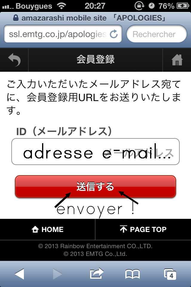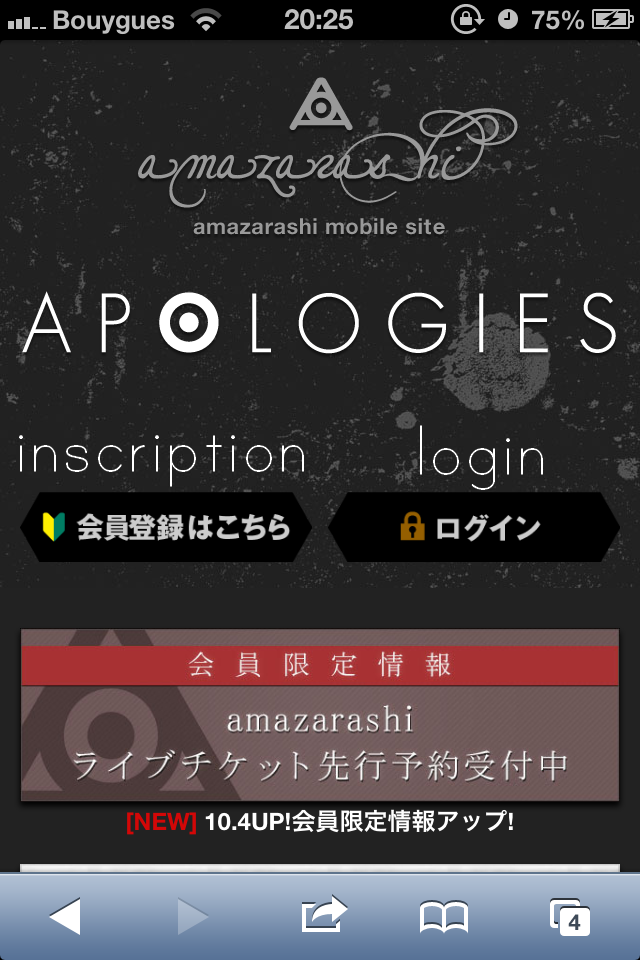Depuis votre smartphone, vous allez sur http://artist-site.jp/apologies/ puis vous avez le choix entre « inscription » ou « login ».