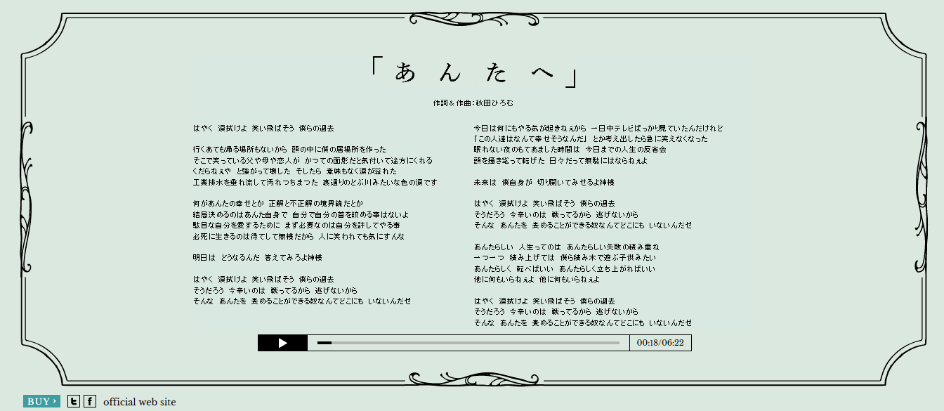 La news vient juste de tomber, 「あんたへ」 (anta e) bénéficiera d’une page spéciale sur le site officiel où la chanson sera en rotation pendant 24h à compter du 29 octobre à minuit, soit cinq minutes après la fin de SCHOOL OF LOCK! (16h chez nous). Si vous habitez au Japon, vous n’êtes plus contraint de rester éveillé jusqu’à minuit pour entendre le nouveau titre d’amazarashi. C’est plutôt une bonne nouvelle !