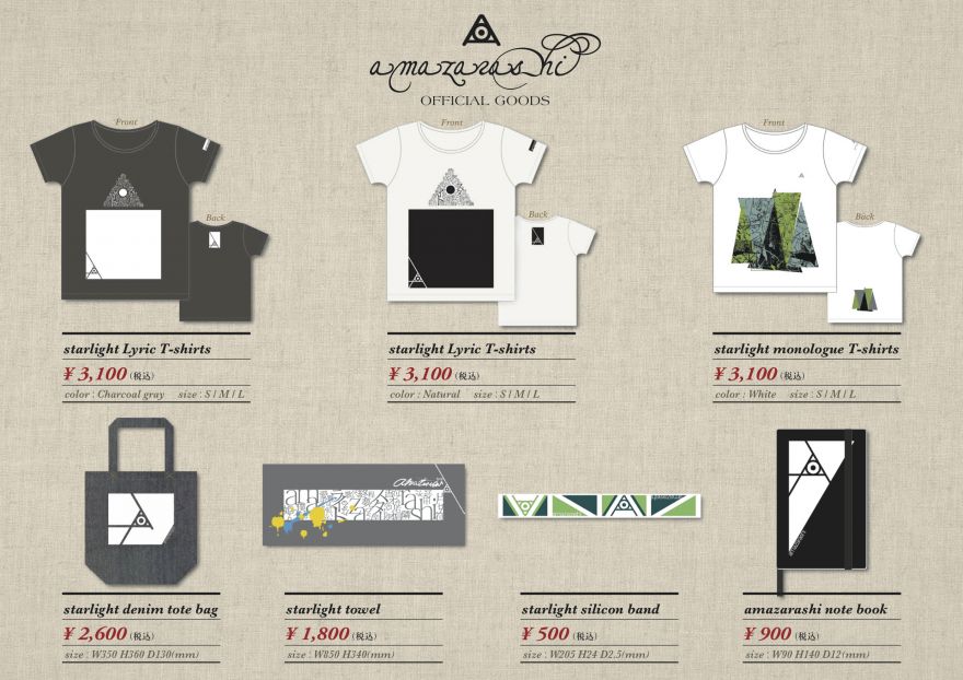 Le lancement du retour de « STARLIGHT » est pour bientôt. Les concerts 「あまざらし プレミアムライブ 千分の一夜物語「スターライト」~アンコール公演」 (amazarashi PREMIUM LIVE senbun no ichiya monogatari « STARLIGHT » ~ ENCORE kouen) de Tokyo et d’Osaka proposeront une liste non-exhaustive de produits dérivés. De la classique serviette au plus rare notebook, vous aurez tout de même du choix.