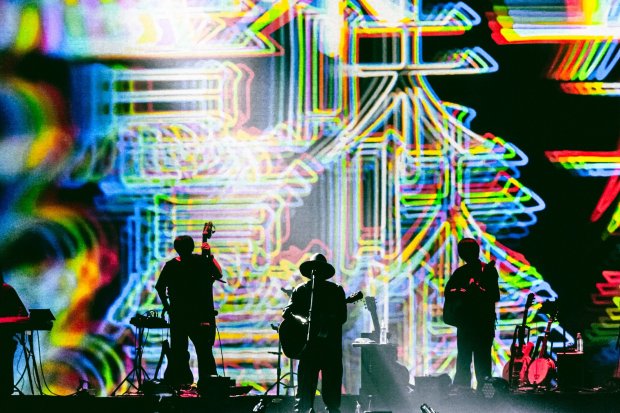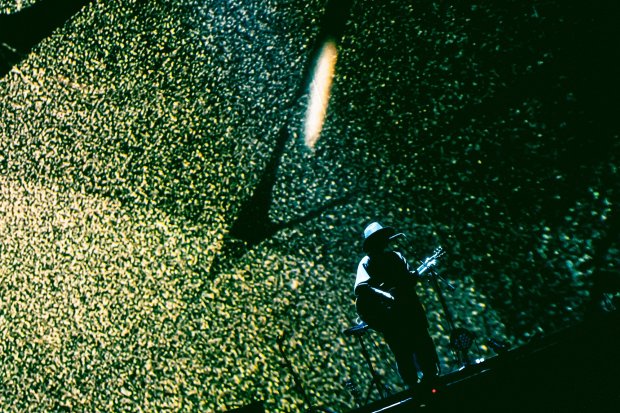 A 19h, le chanteur d’amazarashi fit son entrée sur scène seul, accompagné de sa guitare et de vifs applaudissements. Il commença à jouer quelques accords tout en entonnant 「アンチノミー」 (ANTINOMY). Le musicien était au centre d’un faisceau de lumière et derrière lui, on pouvait voir défiler divers paysages en ruine en noir et blanc, non sans rappeler l’environnement dans lequel se déroule l’histoire de NieR:Automata (A-RPG disponible sur PS4/Switch/PC), jeu vidéo récemment adapté en anime et dont la chanson a servi de générique de fin.