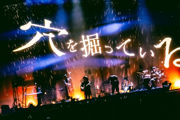 Une performance indescriptible débuta soudainement. La batterie seule, ne laissait rien dévoiler de la chanson qui allait être interprétée. Cette jam session était une belle surprise. Sur scène, on ne voyait que l’ombre des artistes et de leurs instruments, comme un jeu d’ombres chinoises attisant la curiosité des spectateurs. Quand enfin, le piano vint accompagner la batterie, il fut alors plus aisé de reconnaitre 「穴を掘っている」 (ana wo hotteiru). Cette nouvelle version était d’exception, surtout pour une chanson de la discographie aussi discrète. Les lyrics projetés à l’écran étaient encerclés d’arbres morts, représentant la forêt de Jiyugaoka où le clip vidéo a été tourné. Avant le dernier refrain, un long temps de pause a été marqué, si long que le public n’a pu s’empêcher d’applaudir à ce moment-là. Le boeuf de conclusion était tout aussi remarquable et une telle performance aura certainement donné à chacun l’envie de réécouter cette chanson de 2014.